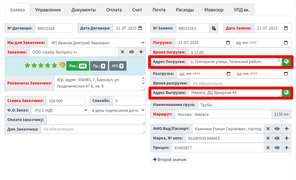В Бульдок можно автоматически рассчитывать стоимость топлива по выбранному экипажу и в выбранном заказе. Для этого требуется заполнить адрес погрузки и адрес выгрузки внутри заказа перевозчика.
