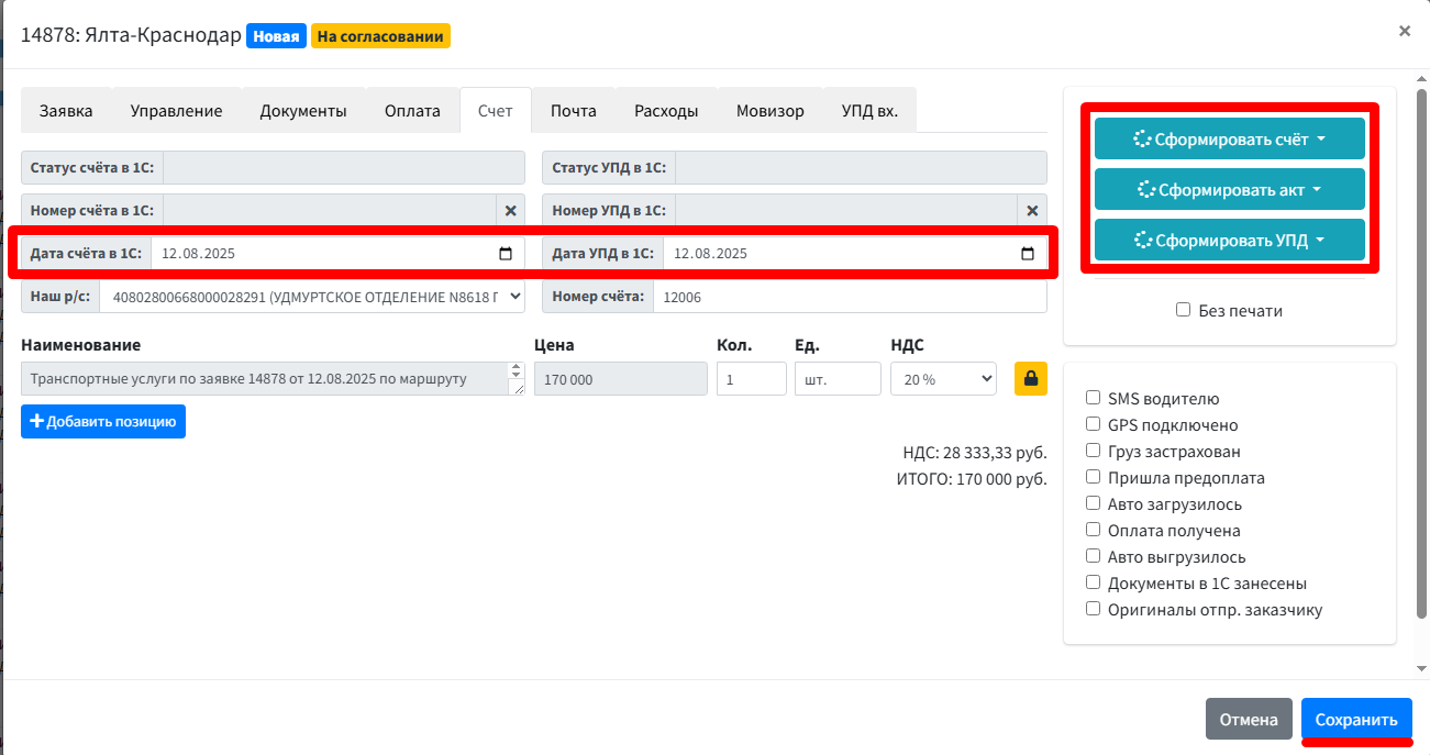 При отсутствии интеграции с 1С можно выставить счет и акт через вкладку "Заявка", номер документов будет равен номеру заявки, если у вас есть интеграция то нужно воспользоваться способом №2