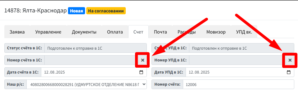 Бывает так что в 1С удалили ошибочные документы, а в Бульдок номера остались. Что бы их очистить нужно нажать крестик внутри заказа и поле очистится.