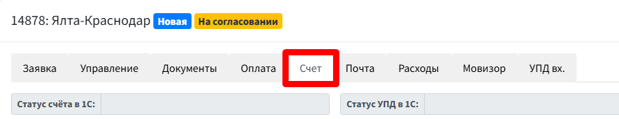 Для выставления счета и акта требуется зайти внутрь заявки и открыть вкладку "СЧЕТ"