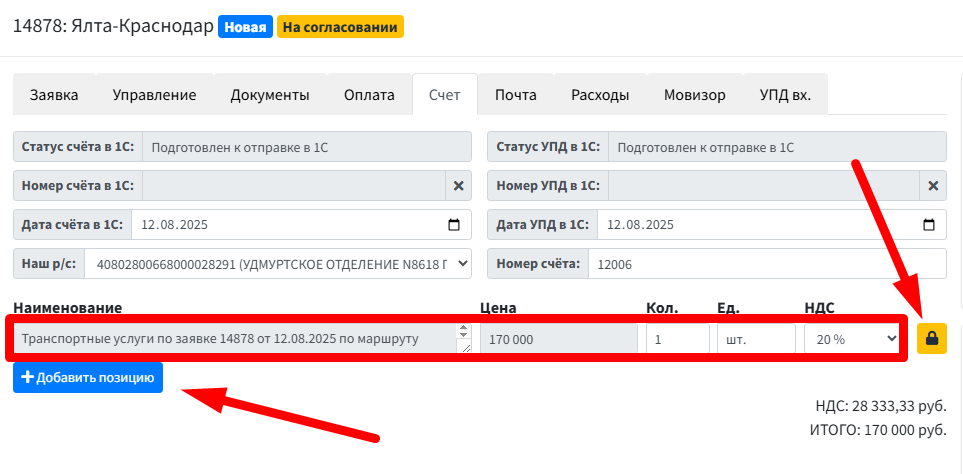 Позицию в счете можно по умолчанию отредактировать в Настройках, так же эти данные будут передаваться в 1С при включенной интеграции.